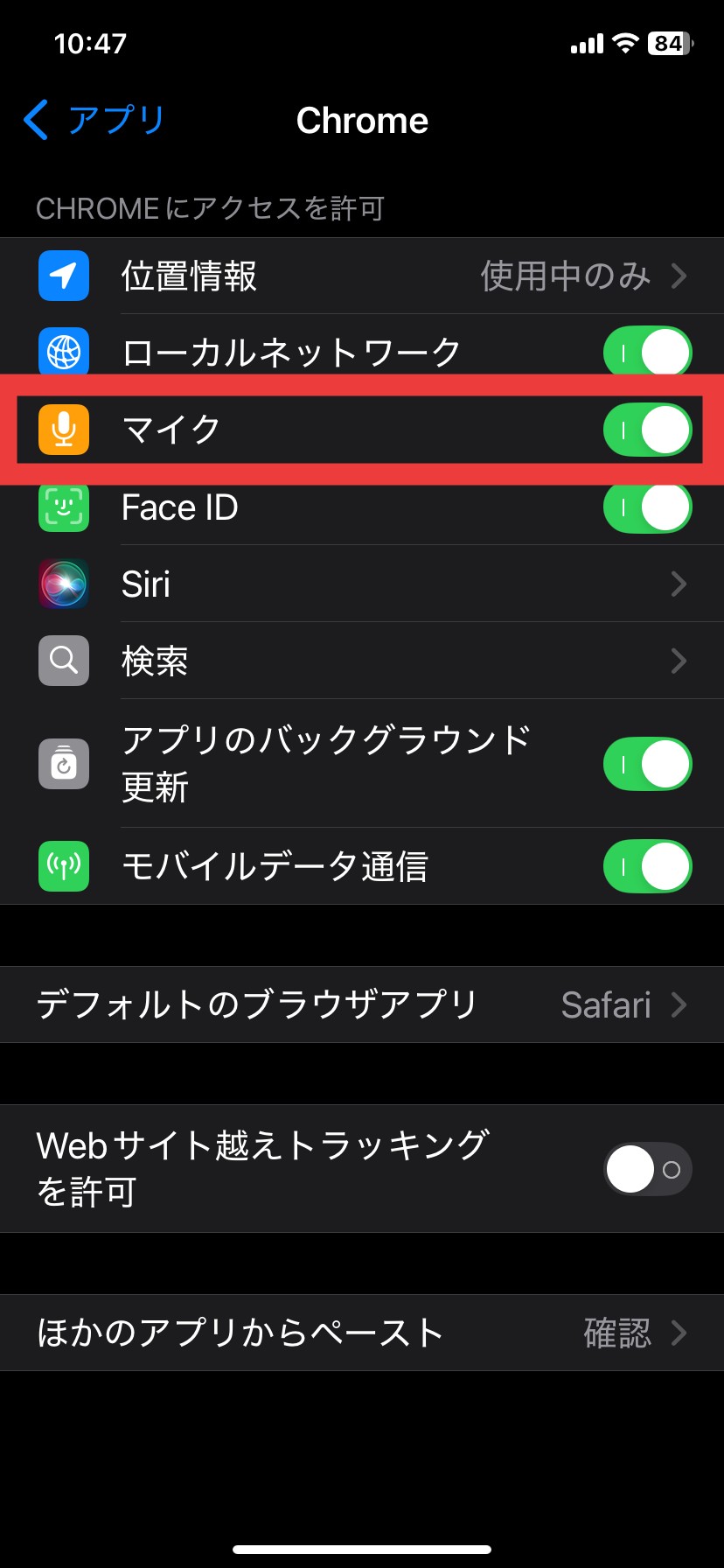 ② アクセスを許可の項目で、マイクの使用許可をONに設定します。