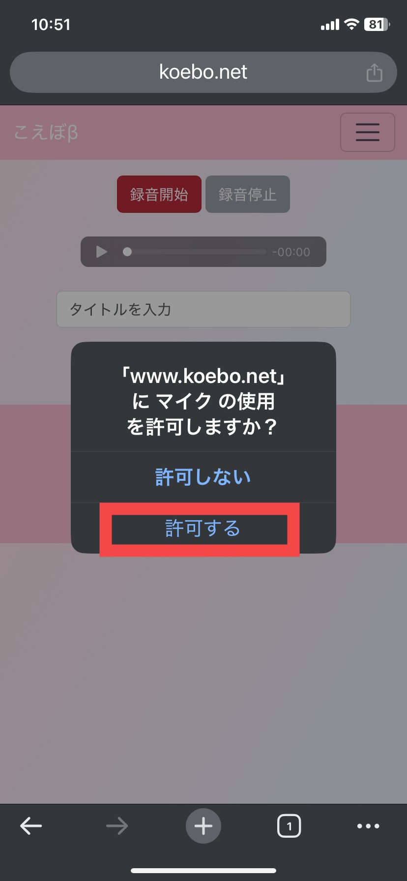③ ワンプッシュ投稿のページに戻り、「録音開始」を押すと、再度マイクの許可を求められますので、許可してください。